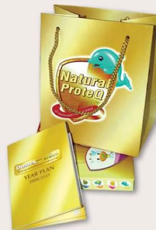 Custom packaging including folders, gift boxes, bags, and display stands with premium finishes and brand integration.